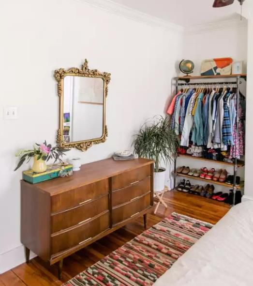 一個(gè)主臥室,主臥室太小,無(wú)法容納額外的衣柜。他們的解決方案是利用房間的一個(gè)小角落制作一個(gè)底部有木制鞋架的便攜式衣架。這個(gè)簡(jiǎn)單的架子實(shí)際上是鋼管和木管的組合。