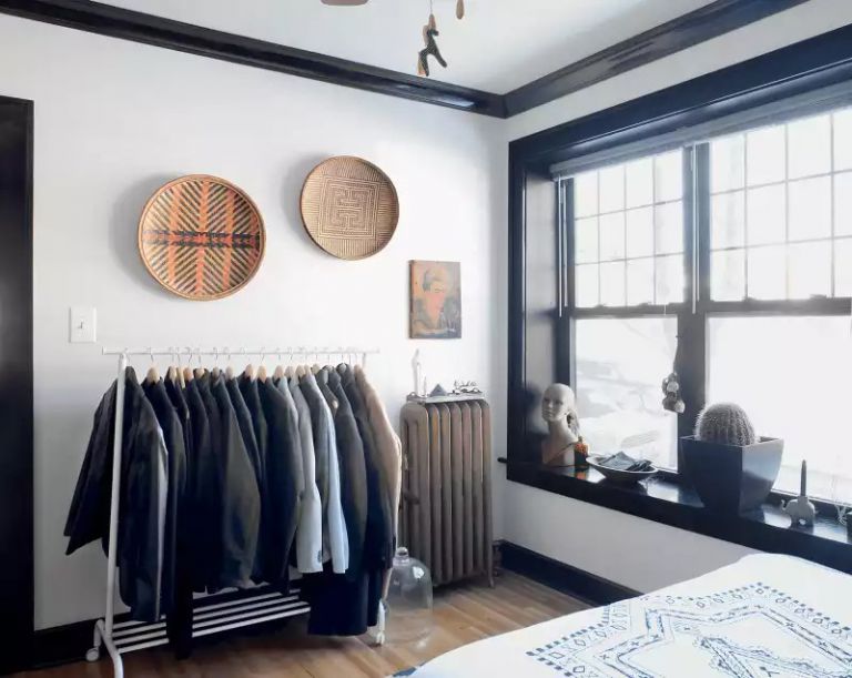 主臥寬敞通風(fēng),但奇怪的是這個(gè)空間沒有衣柜。房主沒有購(gòu)買更多的櫥柜,而是添加了一個(gè)掛衣服的架子。現(xiàn)代懸掛設(shè)計(jì)時(shí)尚而不引人注目。Sidonie 的方法是將衣服掛在視線水平,就像在高檔商店一樣。
